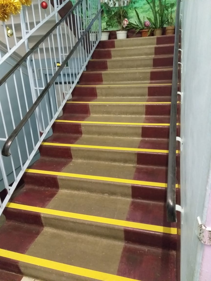 На лестничных площадках нанесены предупредительные знаки для слабовидящих "желтая полоса"/контрастная лента, ступени лестниц оборудованы антискользящим покрытием.