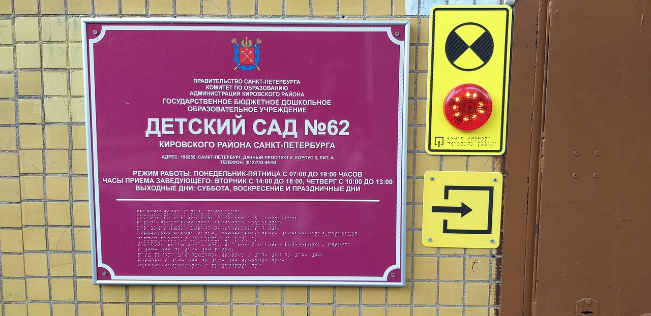 Входы в здание оборудованы информационной табличкой, продублированной рельефно-точечным шрифтом Брайля и кнопкой вызова сопровождающего.